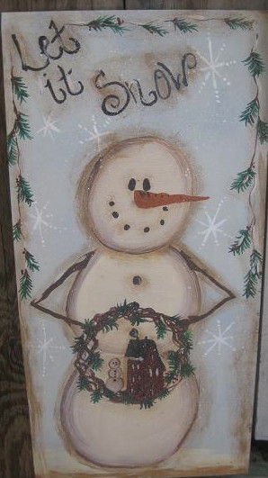 This is a fun let it snow snowman who is holding onto a grapevine wreath with saltbox house complete with a mini snowman.